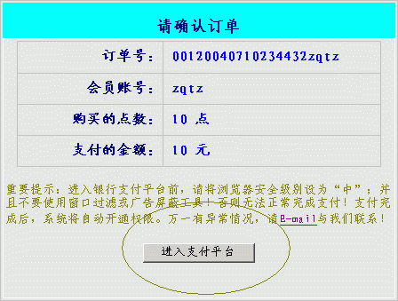【注意】:进行网上银行支付、声讯电话支付、手机短信支付时,除了将浏览器安全级别设为“中”,Cookie设为“中高”外,请务必使用windows自带的IE浏览器,而不要使用MyIe等变种浏览器!一是因为一些网上银行系统只支持IE;二是因为MyIe等变种浏览器往往带有窗口过滤或广告屏蔽功能,这可能屏蔽数据返回页面而造成支付失败!